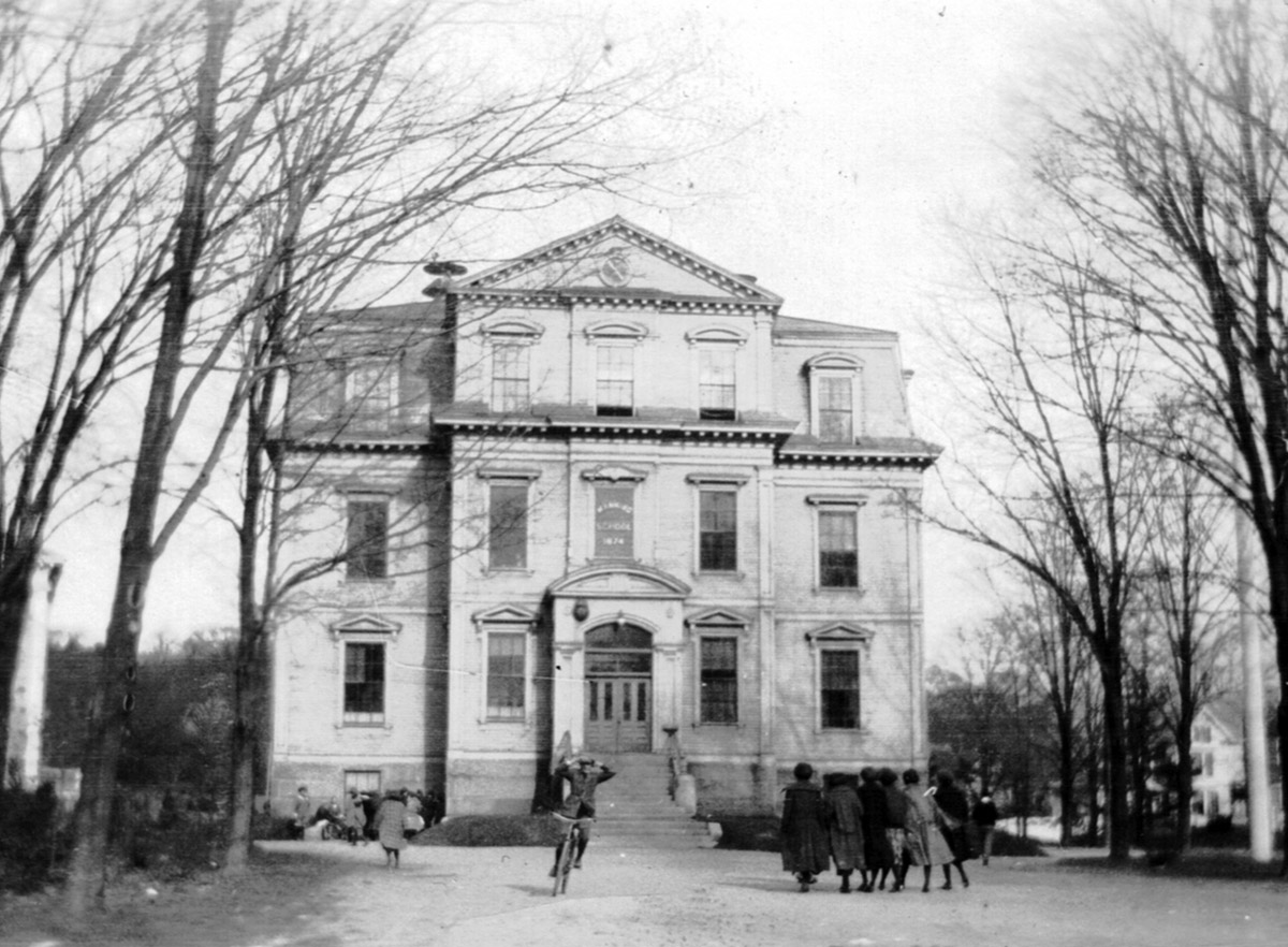 1874: The Manning High School opened on August 26, 1874, and 5 students graduated. The three-story building, with the auditorium on the 3rd floor, was located on Central Street, next to the fire station (on the front lawn of the present Winthrop School). In 1944, the Manning School was finally closed when the Superintendent’s office was moved to the new High School on Green Street. Photo shared on Facebook
