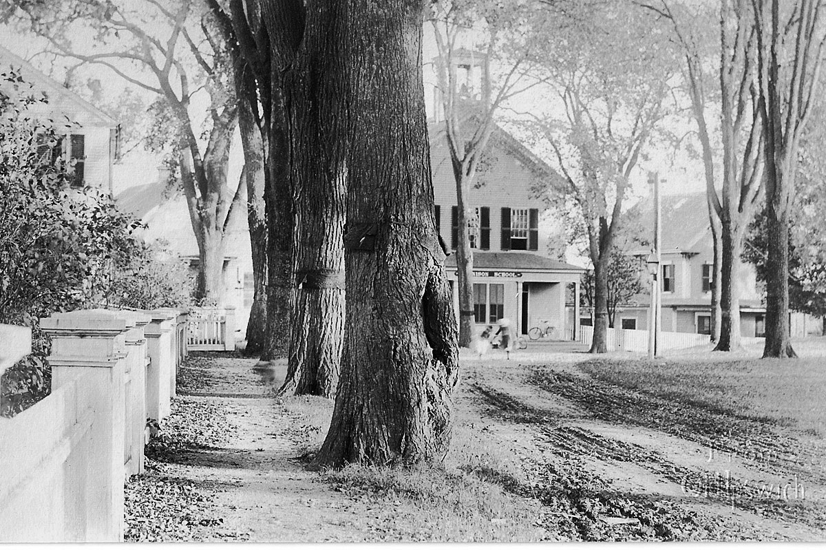 In the 1910 Ipswich village map, the town is dotted with schools. Manning and Winthrop on Central St., and the Burley School are the large facilities. Children are attending classes at the Cogswell School on Payne St., Payne School at Lords Square, the Candlewood School, which has been moved to Manning St., the Warren firehouse has been converted to classrooms, the Wainwright School has moved to Spring St., and the Dennison School is still operating at the North Green.