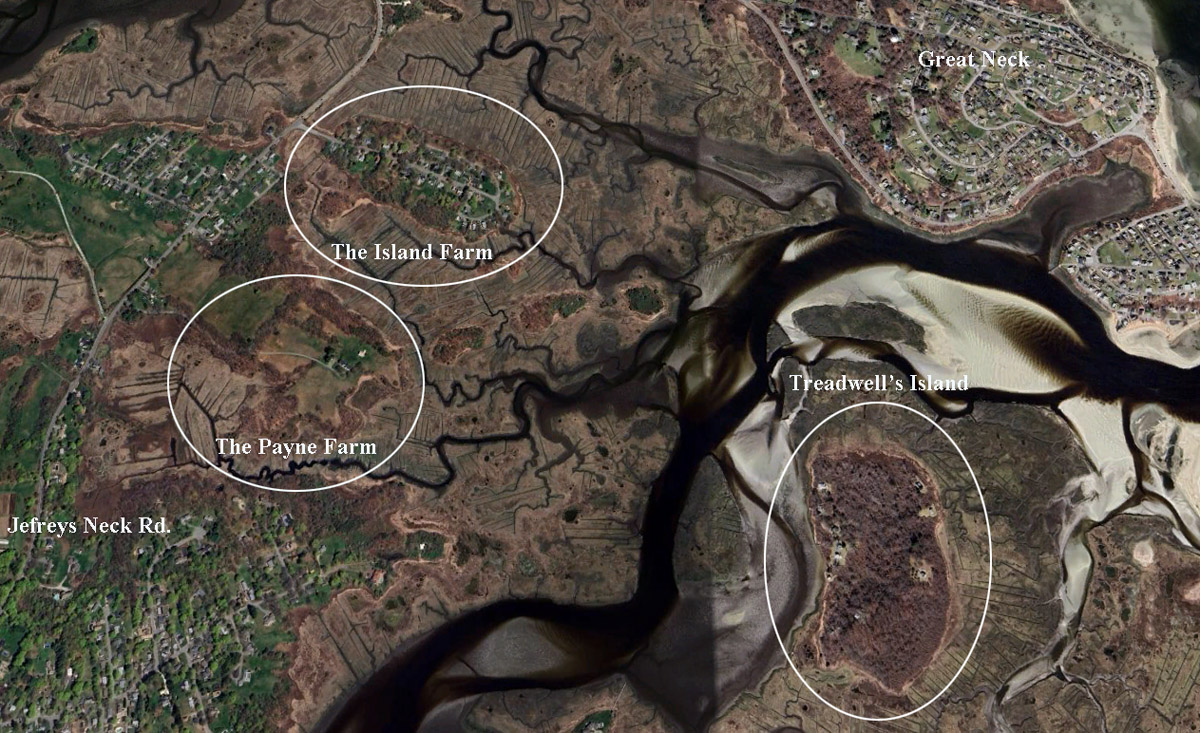 William White received from the Town a 20-acre grant, and on April 27, 1638, he exchanged this grant with Thomas Treadwell, receiving land and money. Surrounded by marsh on every side, at high tide it becomes an island, and came to be known as Treadwell’s Island. He bequeathed to his son, Thomas, “the Island he now dwells in with the meadows and appurtenances belonging thereto.” It included 40 acres of upland and meadow, double the size of the original grant. Unfortunately for the owners of this Island farm, access to it could be had only by boat or over the land of others during low tide.