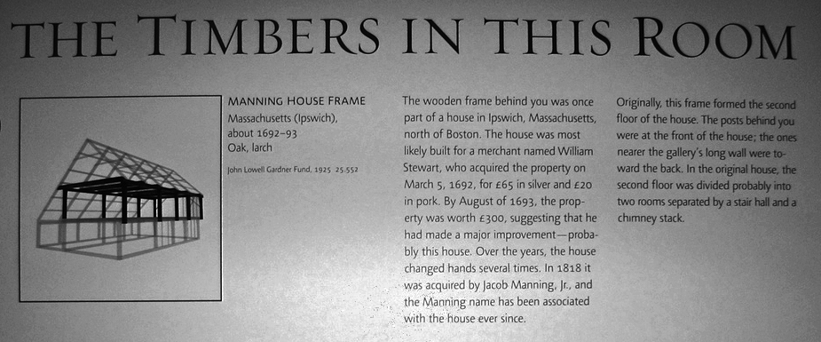 The “Art of the Americas” wing at Boston’s Museum of Fine Arts features building artifacts from Ipswich and the surrounding North Shore area, including the second-floor framing of the Manning house, which was built in Ipswich about 1692 at the intersection of Manning and High Streets. The Manning House was probably built by William Stewart in 1693, and in 1818, the house was purchased by Jacob Manning. It was once used as the town’s almshouse. When it was razed in 1925, the timber frame was preserved and put on display at the Museum.