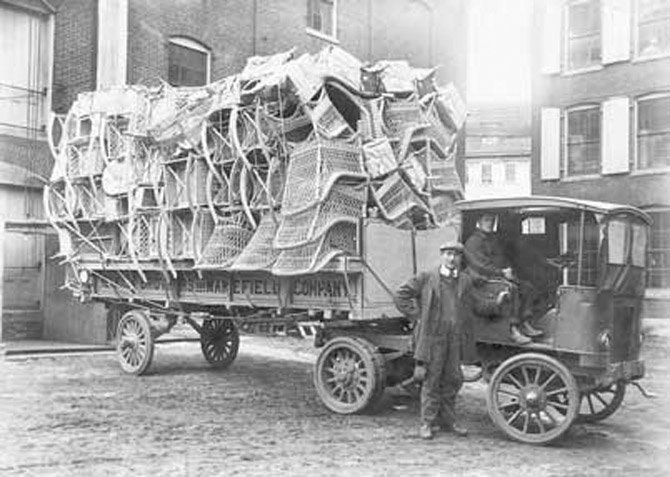 The China Trade and the Industrial Revolution were in full gear. The exploits of the shipping magnate extraordinaire Thomas Handasyd Perkins also interested Wakefield. Soon, Cyrus began importing rattan (a species of climbing palms) from Southeast Asia. He then discovered various ways of utilizing the whole cane in the making of chairs. In 1856, he established a huge rattan works in South Reading, his ancestral home. According to the local historian Charles Eaton, “the manufactories and warehouses covered an area of ten acres … and gave employment to a thousand men and women.” Meanwhile, the Wakefield Rattan Company was served by a fleet of seven ships, which brought the raw material stateside to be fabricated in the furniture factory.