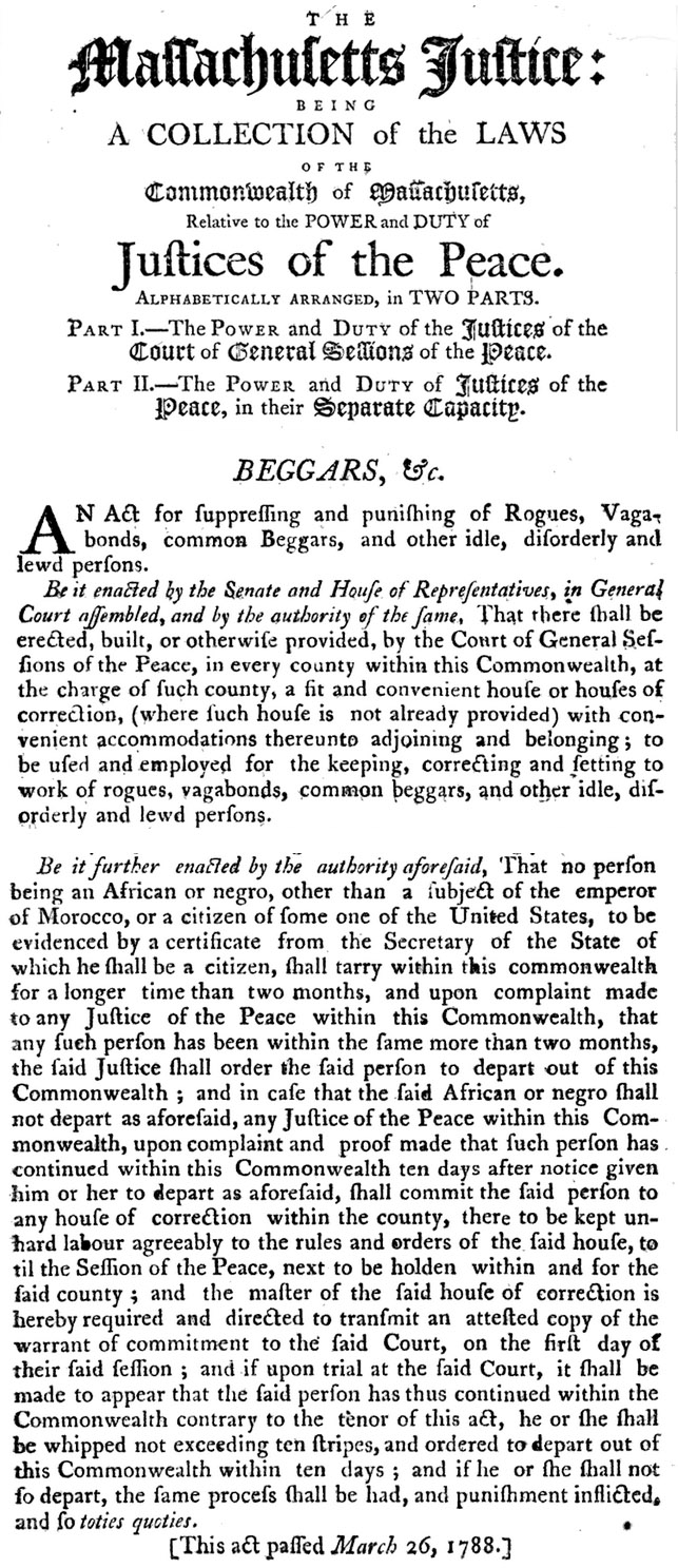 Massachusetts 1788 law banning the residence of negroes and mulattoes