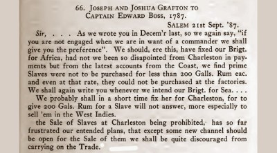 The General Court of Massachusetts passed an act on 26 March 1788to prevent the Slave Trade, and for granting Relief to the Families of such unhappy Persons as may be Kidnapped or decoyed away from this Commonwealth.” The law imposed a penalty of £50 upon every citizen or person residing in this Commonwealth for each slave bought or transported, and £200 upon every vessel engaged in the Slave trade.