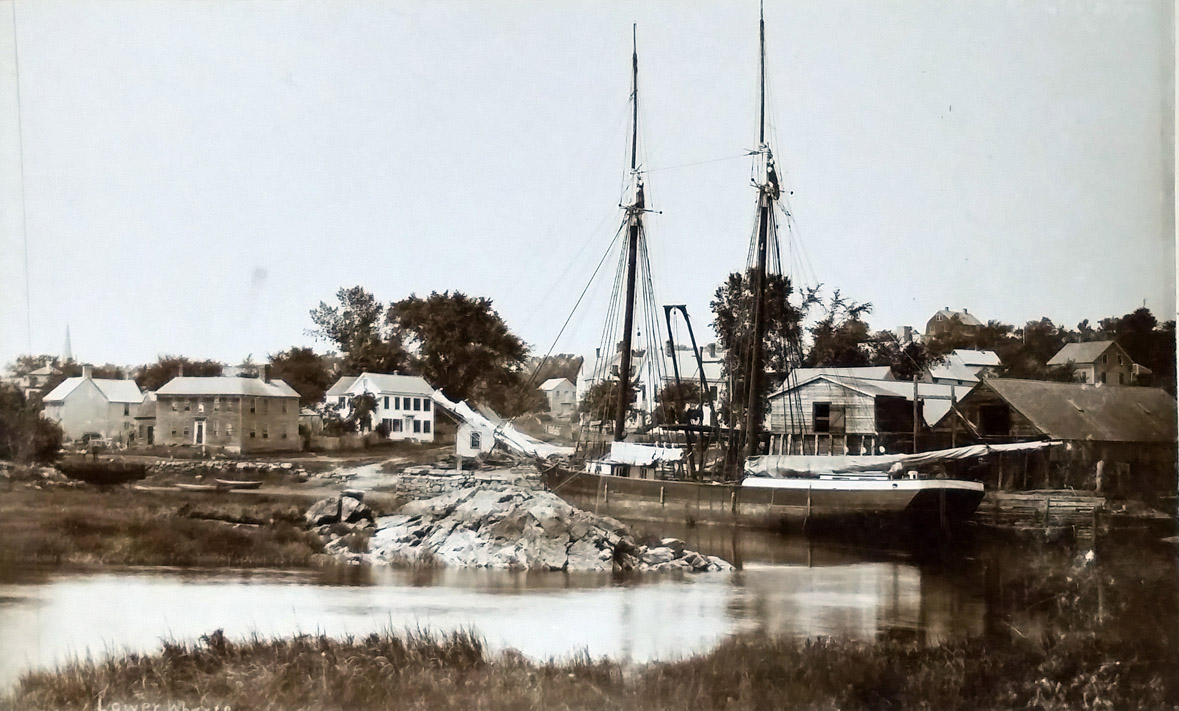 Where the Outboard Ramp is now located was Choate’s Wharf, at the foot of Choate’s Court, now known as Scotton’s Lane. Further downstream on the left, there was another town landing at the foot of Hovey Street. Howard Dodge had a building there where he stored coarse bar sand and sold it to masons for plastering. Still further along, a landing existed this side of Granite Wharf. To the right was another town landing and wharf at the foot of Tansy Lane, but it’s hard to find now, although it was called to the attention of the Selectmen several years ago to see if it could be opened.