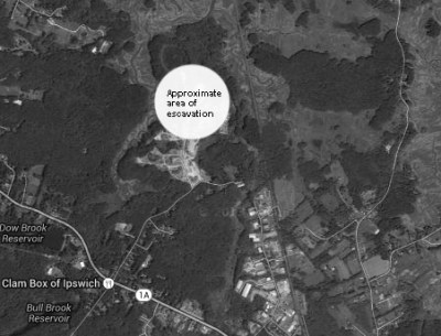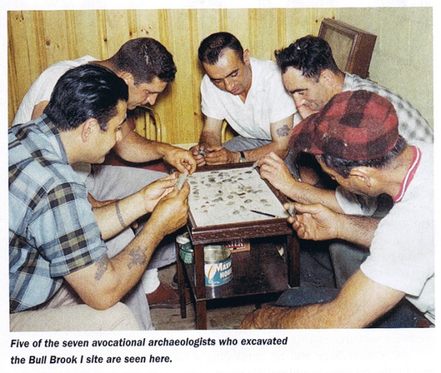 A half mile behind that site, in the early 1950s, a group of young amateur archaeologists, men now known as the “Bull Brook Boys,” discovered one of the largest Paleo-Indian sites in North America along the banks of Bull Brook and the Egypt River in an area being cleared for a sand and gravel operation at the end of Paradise Road. Over 6,000 artifacts were uncovered in a large circle about the size of four football fields, and are on display at the Peabody Essex Museum in Salem. With 42 loci, the site was nearly four times larger than the next largest site in North America. Two more discoveries were made in the late 1960s, but the site is now a gravel pit.