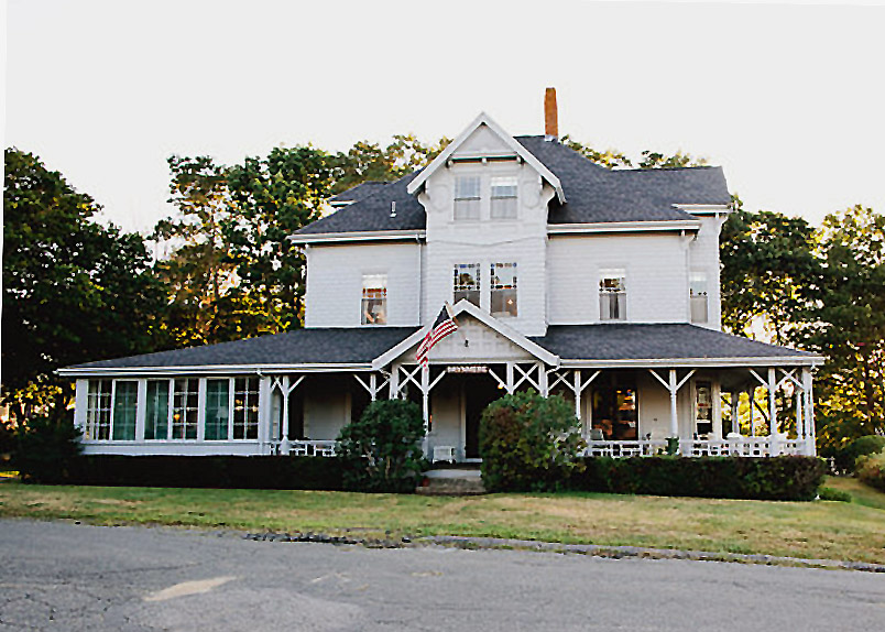 The Turk’s Head Inn was at the intersection of South Street and Thatcher Road in Rockport, with a sweeping view of Loblolly Cove and the twin lighthouses on Thacher Island. The original right section was burned in 1905 and was replaced by a rectangular structure. The inn was destroyed by fire and was replaced by the Turk’s Head Motor Inn.