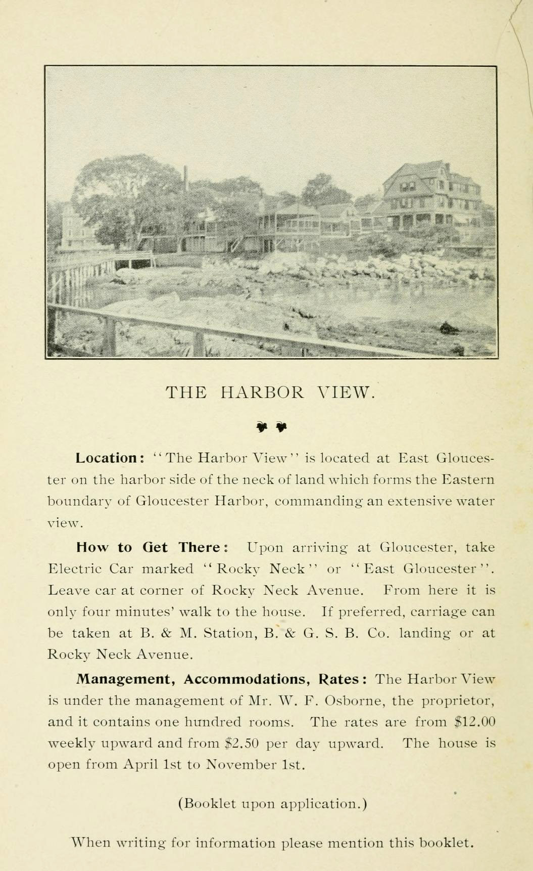 “Gloucester, Massachusetts— the place you come back to — is situated on that rugged promontory known as Cape Ann, where cooling ocean breezes blow continually from off the broad Atlantic. It is thirty miles from Boston, from which it may be reached by Train, Steamer, Trolley, or Automobile. About sixteen trains daily leave the North Station, Boston, via the Boston & Maine Railroad, direct for Gloucester, the Express Trains reaching Gloucester in less than an hour.
