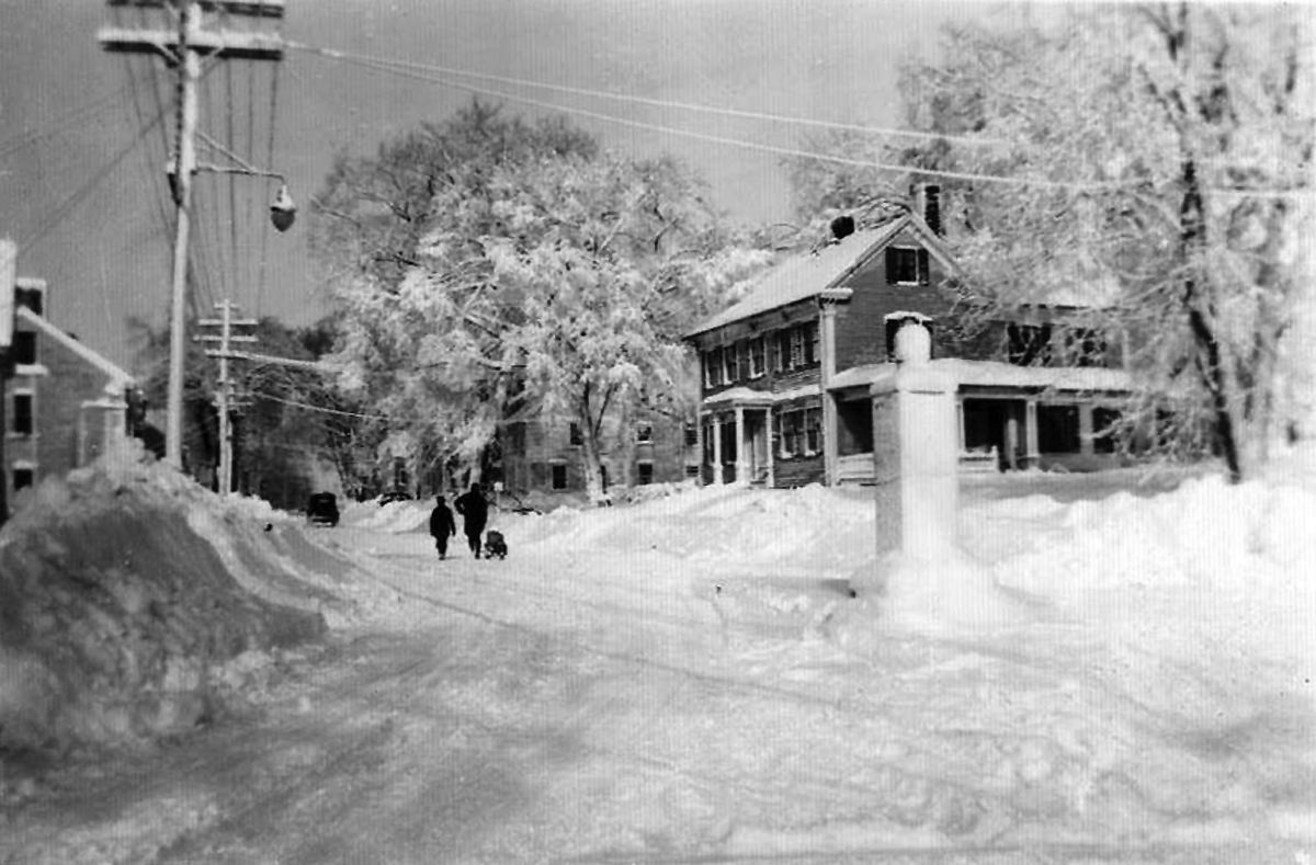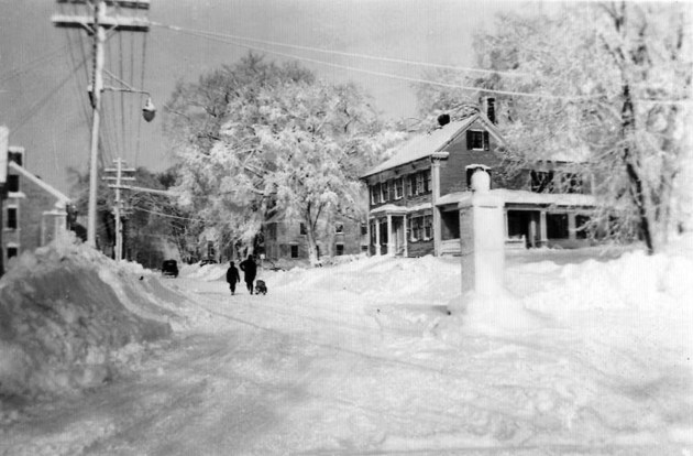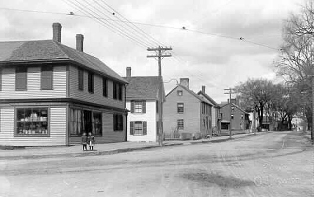 This old photo above is from the first half of the 20th century, soon after Asa Lord’s Store was demolished. Three buildings remain today: the old firehouse on the far right, the former Marcorelle’s Store on the far left, and the Paine School in the middle. Asa Lord’s store faced High Street and would have been approximately where the traffic island is now, and had already been split apart and moved to two separate locations as residences. The Prime service station sits today in the triangular patch between the two trees. The two buildings between the right tree and the old fire station on the far right are gone. The chimneys on the large two-story Georgian house that sat at 1 Linebrook Road in 1994 can be seen over the roof of the smaller house that was demolished to build the building that is now a laundromat.