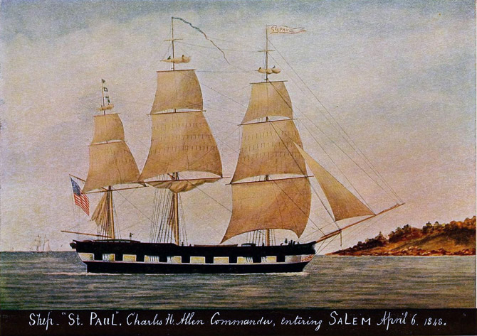 Among the many ships famous in the early days of Salem’s maritime history, none is more deserving of honorable mention than the good ship St Paul. The vessel was built in Boston in 1833. The St Paul was the largest vessel of her time owned in Salem only two others exceeding 400 tons. Her departure from Salem was watched from headland to headland until she was lost to view, and on her return, many an eye awaited her coming and looked brighter when she came; her cargoes filled the spacious storehouses on Phillips Wharf.