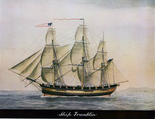 The ship “Franklin” of Boston, 200 tons burden. She sailed from Boston on December 11, 1798, bound for Batavia on the island of Java. At that time, the entire foreign trade of Japan was controlled by the Dutch merchants in Java. On the arrival of the “Franklin”, she was chartered by the Dutch East India Company for 30,000 piastres, for a voyage to and from Japan. This was the first voyage of an American vessel to Japan.