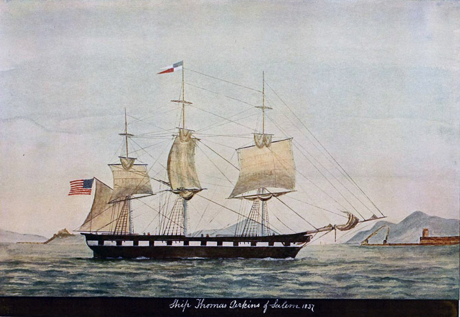The ship Thomas Perkins of Salem was built at Portsmouth in 1837 for David Pingree and Emery Johnson. She was named by Mr. Pingree for his uncle Thomas Perkins, who was born in Topsfield, April 2, 1758, and died there November 24, 1830. Beginning life as a shoemaker, Mr. Perkins came to Salem at the age of twenty-two and shipped on board a privateer in company with Joseph Peabody, who afterwards became his business partner. They were also together on the letter of marque brig Ranger, Captain Simmons, when she was attacked in the Potomac River in 1782 by three British Tory barges, which were brilliantly repulsed. He became captain of the privateers Spitfire and Thrasher, and in the latter captured six prizes in a single cruise. He was frequently referred to as Captain Perkins and became an eminent merchant, his enterprise aiding very materially in building up the reputation of the City of Salem.