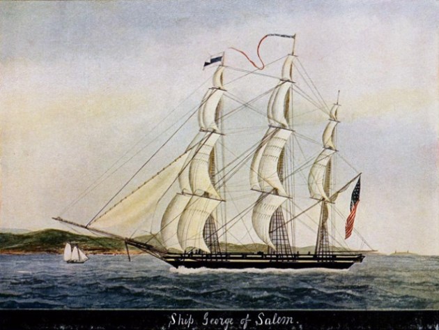 The ship George was one of the large fleet of merchantmen that owed its existence to the enterprise of Captain Joseph Peabody of Salem. For twenty-two years, she plied with the regularity of a shuttle between Salem and Calcutta and ranked first in the fleet for speed and reliability, probably excelling in these qualities any other Indiaman in the country. Her average outward voyages were one hundred and fifteen days in length, and her homeward passages averaged one hundred and three days. She was built at Salem in 1814 for a privateer by a company of ship carpenters who the war had thrown out of work.