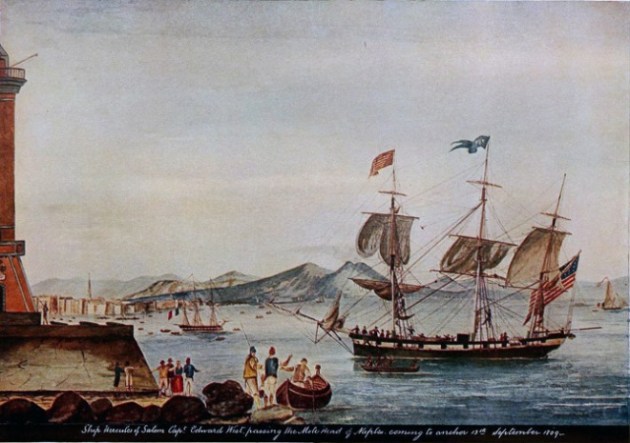 The private armed ship America was the largest, the fastest, the most fortunate, and the most famous of all the privateers that at any time sailed out of Salem Harbour. She was built for a merchantman in 1803 by Retire Becket under the eye of George Crowninshield Jr. In those days, every ship had to protect itself. Algerine and Barbary corsairs made the ocean routes and the Mediterranean unsafe, and neither England nor France showed us much more quarter than the pirates. The ship America was launched with portholes in her sides and never put to sea without heavy armament.