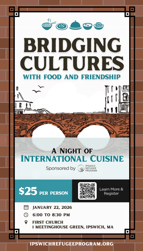Join the Ipswich Refugee Program on Thursday, January 22, at First Church in Ipswich for a night of international Cuisine, sharing food and stories, and celebrating the many different backgrounds, ethnicities, and nationalities that make up Ipswich. Tickets are $25 per person. The organization encourages individuals and businesses to partner with the program through a Community Partner Sponsorship, which includes 4 tickets to the event.