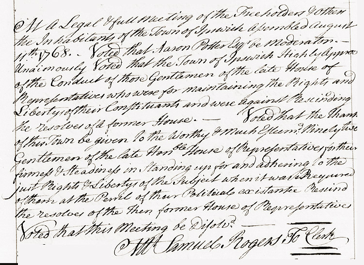 The voters of the Town of Ipswich resolved on August 11, 1768, “That the Town of Ipswich Highly Approves of the Conduct of those gentlemen of the late House of Representatives who were against rescinding the resolves of a former House, and that the thanks of this Town be given to the worthy and much esteemed ninety-two gentlemen of the late Honorable House of Representatives for their firmness and steadiness in standing up for and adhering to the just rights and Liberties of the Subjects when it was required of them at the Peril of their political existence, to rescind the resolves of the then former House of Representatives.”