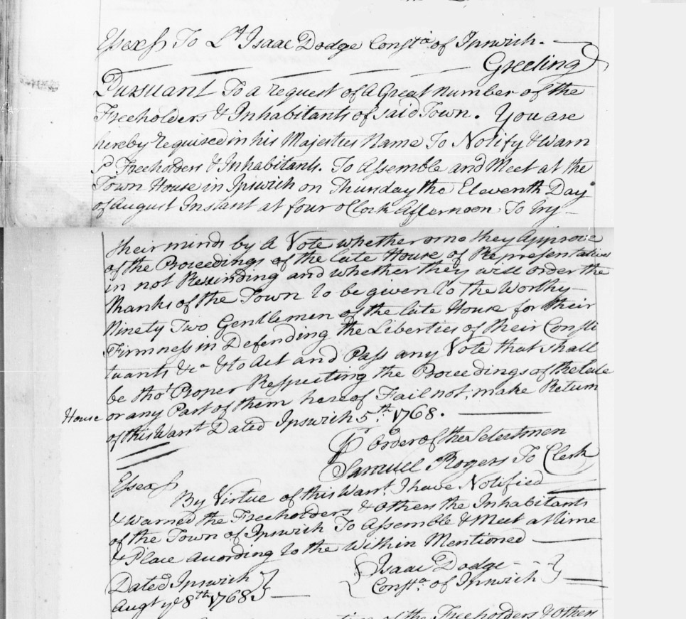 On August 5, 1768, the voters of the Town of Ipswich were notified to “Assemble and Meet at the Town House in Ipswich on Thursday the Eleventh Day of August Instant at four o’clock afternoon to vote whether or not they approve of the proceedings of the late House of Representatives in not rescinding and whether they will order the thanks of the Town to be given to the worthy ninety two gentlemen of the late house for their firmness in defending the Liberties of the Constituants”