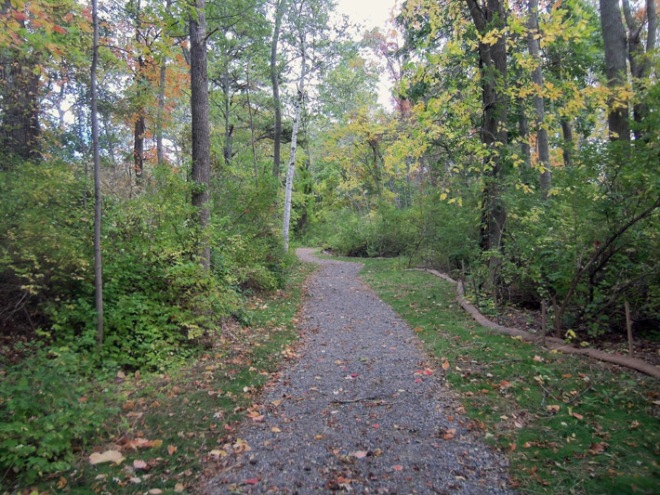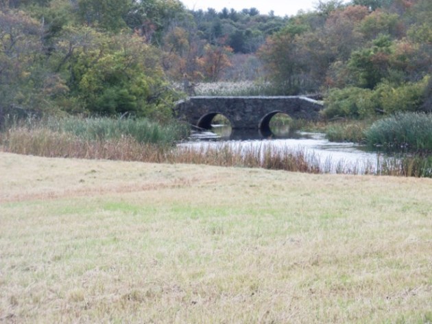 View of the simulated stone arch bridge from a field section of the trail near the parking lot.