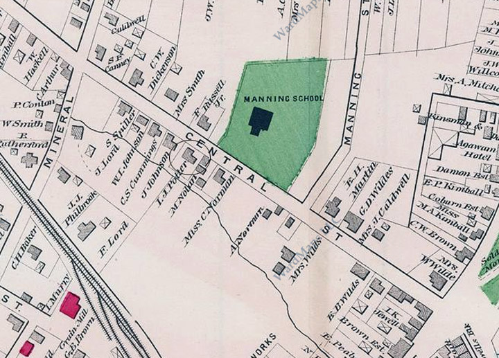 The house is circled in this close-up from the 1884 Ipswich map. The next building on the right is the business owned by M. Nolan. That site is now the laundromat. The Carrie Norman house is beside it, across from Manning School.