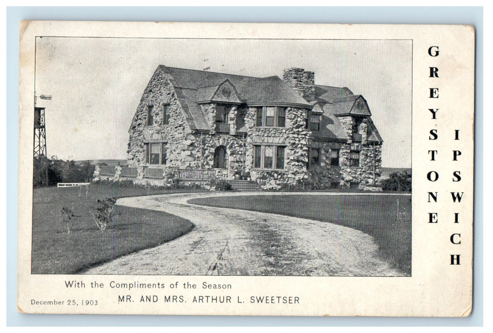 Arthur L. Sweetser, a Boston banker, built Greystone, his summer home on Labor in Vain Road in Ipswich. His wife was Laura Attwill.