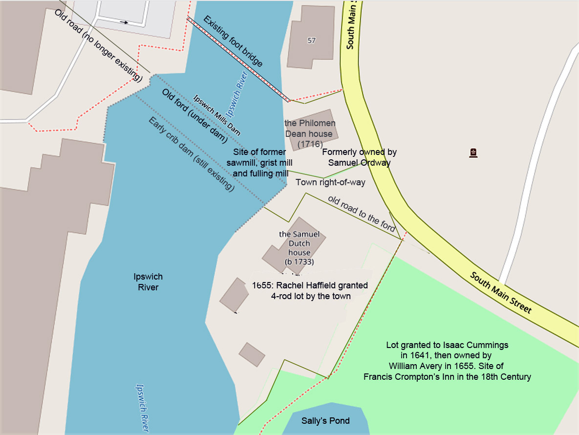 On May 9, 1723, Ruth White’s son Thomas White Jr. (1664-1740) sold the four full rods near the Mill Dam to Samuel Dutch, “being formerly granted the widow Martha Haffell by the freeholders of Ipswich, bordered east upon land now in possession of Philemon Dean,” etc., for £5 (42: 106). No buildings are mentioned in the deed. Rachel Clinton’s small house on South Main Street must have been removed at about this time, for the Ordway deed of 1691 lists her as an abutter, and the sale of the Ordway property to Philomen Dean in 1715 mentions an old house still standing on the lot.