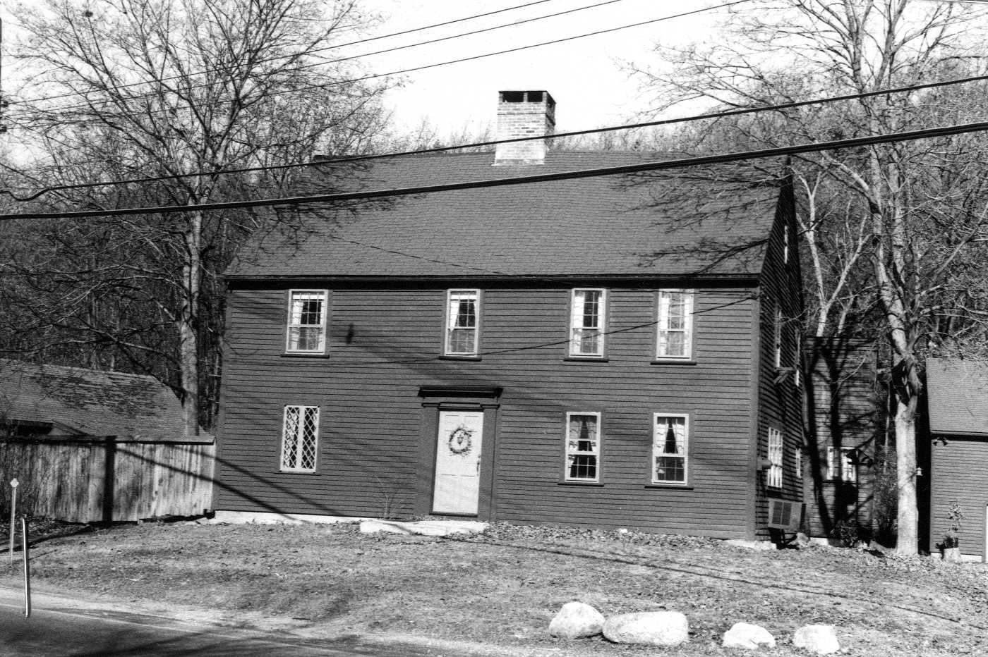 At Aaron’s death in 1826, the northwest end of the house was assigned to Aaron’s widow, and after her death to Eliza, wife of Mark F. Cate, and the southeast end to Hannah Jewett Hale, Eliza’s sister. By 1832, Cate owned the entire house. Reference is made to Cate’s currier’s shop on the property in a deed. Whether or not the shop is one of the two outbuildings that survive nearby is uncertain. Cate’s unmarried daughters lived there all their lives. Caroline Cate Colazo became the owner in 1911.