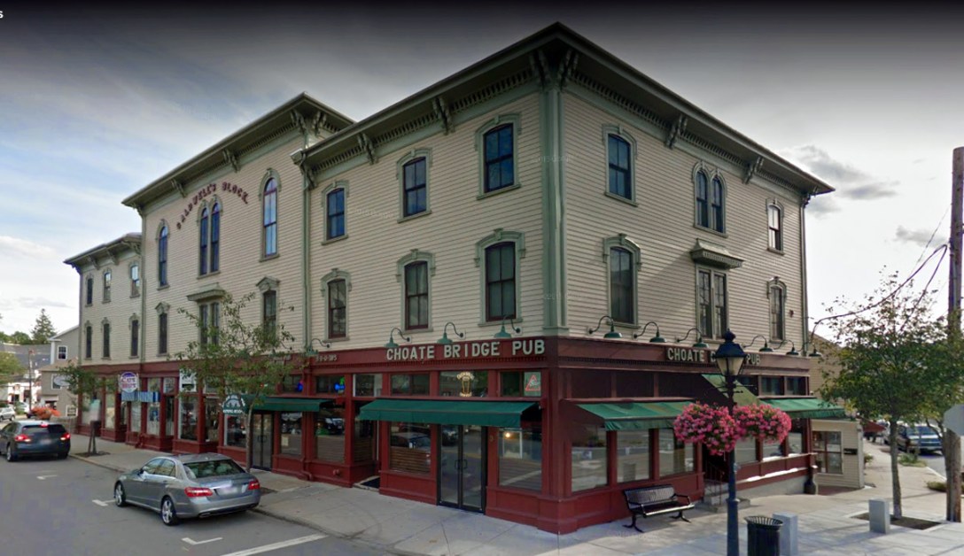 The Caldwell Block at the corner of South Main and Market Street is the oldest large building in the commercial section of Ipswich. The photos below show that despite the change of establishments, the building remains easily identifiable. The Choate Bridge Pub anchors the corner now, but when John Updike had his office upstairs, it was the Dolphin Restaurant.