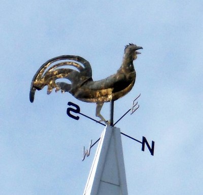 Chuck Cooper tells us that at one point in time, his grandfather, Charles Rand, who was a plumber in Ipswich, repaired the weathercock. He used a blow torch to re-solder the pennies, which are the “eyes” of the rooster.