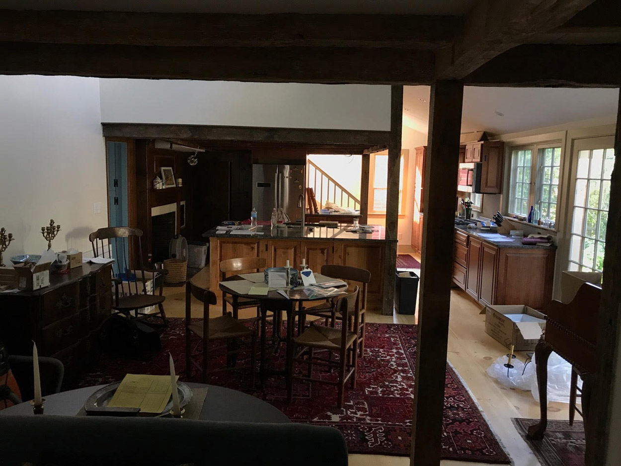 The Foster family constructed three First Period houses in this neighborhood, including the James Foster house across the street, and the ancestral Reginald Foster house around the corner on Water Street. James Foster, son of Reginald Foster, purchased this lot in 1717 and is presumed to be its builder. Although constructed at the end of the First Period, the house has early Georgian interior architectural elements and shows no indication of having once had a central chimney. The ceilings are low throughout the house; beams and joists previously covered with plaster were exposed during a 20th-century restoration. More recent renovations connected two small ells in the rear of the house and added a “Beverly jog” for additional access to the second floor.