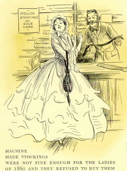 The machine-made hosiery was not fine enough to suit the more fastidious ladies of 1860, and therefore, we find them refusing to purchase the stockings. This attitude on the part of the buying public had its effects on the development of the industry, and for some years the manufacture of hosiery at Ipswich was carried on in but a small way.