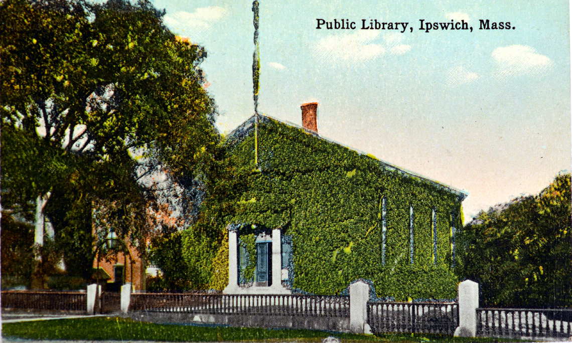 The Ipswich Public Library at 25 North Main Street is a 1869 Greek Revival building constructed in 1869. Nathaniel Treadwell had purchased a dwelling house on an eight-acre lot facing North Main Street on Nov. 3, 1761 (109: 278). The heirs sold the old Treadwell home and land to the Trustees of the Public Library on July 11, 1865 (686: 160). The library and the first books were a gift to the town from Augustine Heard, and Professor Daniel Treadwell, in his will, made a large addition to the endowment. The wings on either side were added later. A portion of the land had been previously sold to the County to build a Probate Office, which was sold to the Agawam Lodge of Odd Fellows in 1867 when the deeds were transferred to Salem (739: 246).