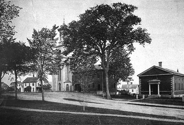 “Moses Treadwell sold the County of Essex, a piece of land 28 ft. square, at the north corner of his homestead. May 27, 1816 (215: 242). The widow Susanna Kendall sold a plot 23 ft. x 28 ft. in May, 1816 (215: 241), and the County proceeded to erect the brick building, used for a Probate Office for many years. It was sold by the County to Agawam Lodge of Odd Fellows on Dec. 26, 1867 (739: 246). The Treadwell heirs sold the house and land to the Trustees of the Public Library on July 11, 1865 (686: 160), and the Library building was built on this lot.” (*Ipswich in the Massachusetts Bay Colony)