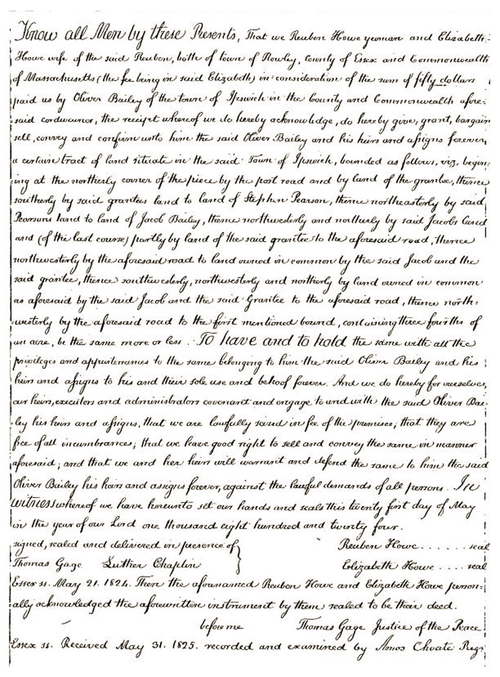One of his descendants was Oliver Bailey, a cordwainer (shoemaker) and farmer, born November 7, 1794. and died January 6, 1878. He was the son of Pierce Bailey and Salome (Bailey) Bailey of Ipswich Village and married Judith Howe of Rowley. He purchased 3/4 acre in 1825 from his wife’s parents Reuben and Elizabeth Howe (Salem deeds 238, 103).