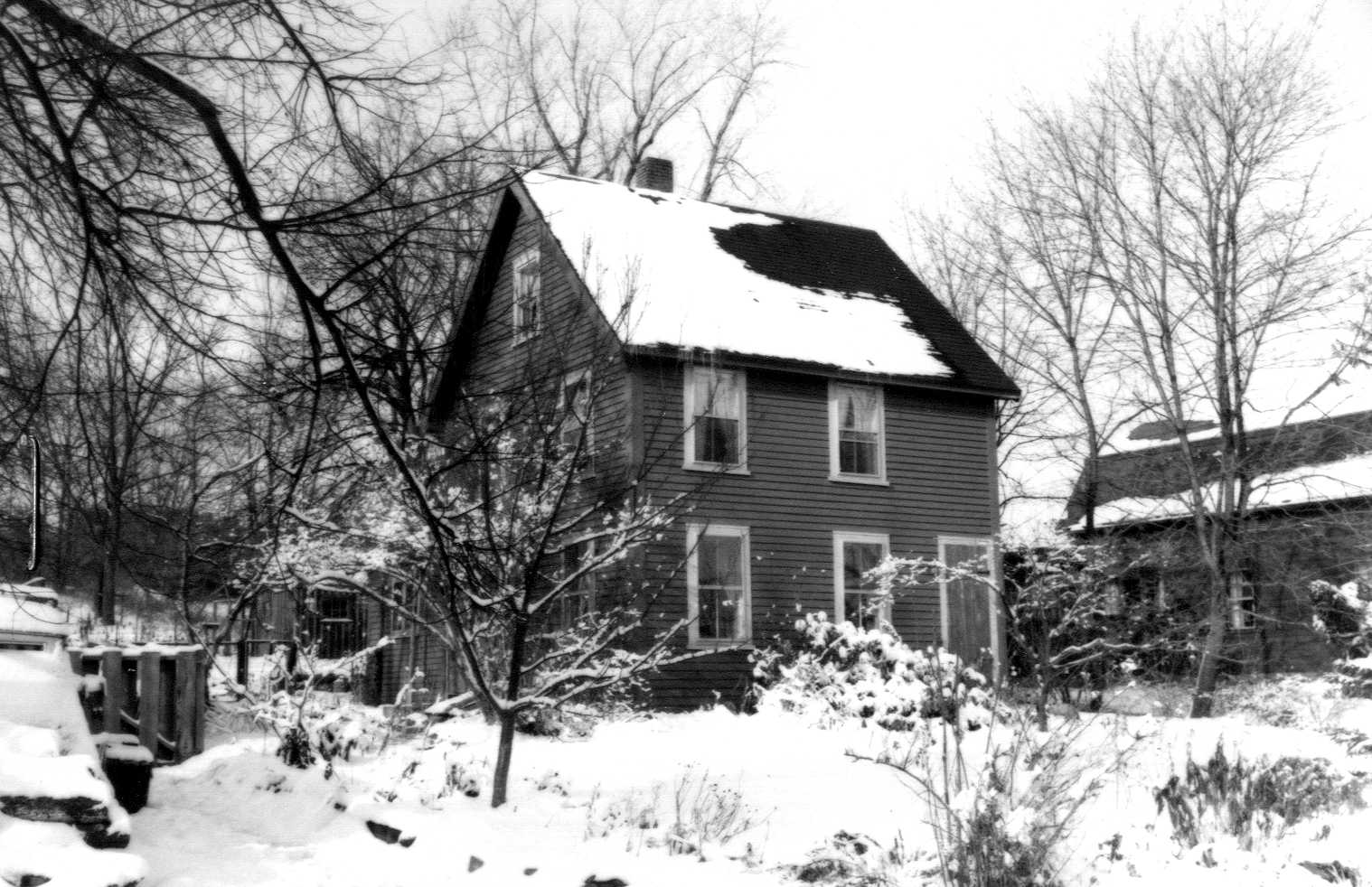 Deacon Francis Caldwell and Tyler Caldwell sold a “certain piece of land on the road to Jeffreys Neck,” measuring 61 ft. on the road and 290 ft. deep, for $150.00 to Oliver L. Sanborn, October 25, 1854. In Caldwell’s deed, there is no mention of buildings (520:198). It is assumed that Oliver Sanborn built this house in 1855, but it would be an unusual mid-19th-century example of a “half-house” with a steep roof, usually associated with the 17th and 18th centuries. Perhaps an older house was moved to this location, and further investigation is warranted.