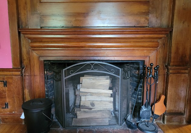 This house has two chimneys, but they are not symmetrically arranged. Paired chimneys became popular in the late 18th Century. The right chimney is supported by a massive brick arch, generally found in the late 18th and early 19th centuries. Rumford fireplaces are found throughout the house, and were common from 1796, when Count Rumford first wrote about them, until about 1850. The upstairs bedroom fireplace surrounds are Federal in appearance; the parlor appears to have been fashioned as a replica of an earlier period, and its fireplace surround is Georgian in character. The room opposite has an ornate Victorian-era fireplace surround.