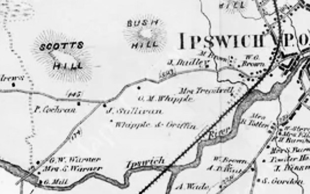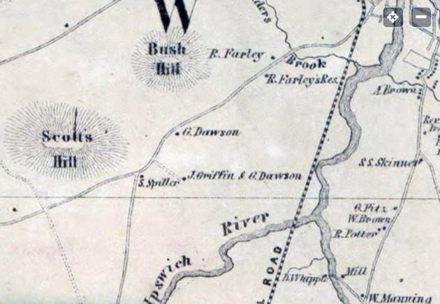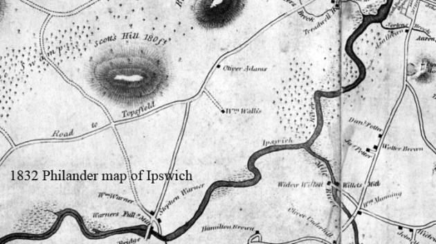 Thomas Franklin Waters wrote that in 1667, Nicholas Waters was among a group of men who proposed to build a dam at the location of the Mill Road bridge. “Sar. Nicholas Wallis,” whose farm is now owned by the Brooks heirs, received permission in March 1686-7 “to improve the water by damming in the river against his own land not exceeding three feet for building a fulling mill or mills, provided he do it within a year and a half.” Sergeant Wallis did not improve his privilege. In March. 1696-7, John Adams, Sen., his son John, Jim, and Michael Farley Jun. petitioned the Town for permission to build a dam, and operate a grist mill and a fulling mill.”