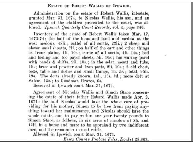 Ensign Nicholas Wallis (1633-1711) was born in Ipswich to Robert and Rebecca Wallis, who were among the first settlers in Ipswich. Land at this location for a large farm was granted to him in 1639. He married Sarah Bradstreet. Sarah Bradstreet Wallis was born in 1638 in Ipswich (now Rowley) . Her parents were Humphrey and Bridget Bradstreet. Sergeant Robert Wallis 3, son of Ensign Nicholas Wallis and Sarah Bradstreet, was born March 12, 1661. His mother, Sarah Bradstreet Wallis, was born in 1638 in a section of Ipswich that became Rowley. Her parents were Humphrey and Bridget Bradstreet. In 1697 Sargent Robert Wallis held the position of Surveyor of highways. He served as a selectman in 1719-20. In that year, seats were appointed to him and his wife in the Meeting House. Joining many of the town’s distinguished leaders in the Men’s Third Row was Sergeant Robert Wallis. In the Women’s seat across the alley were the leading women, including the wife of Robert Wallis.
