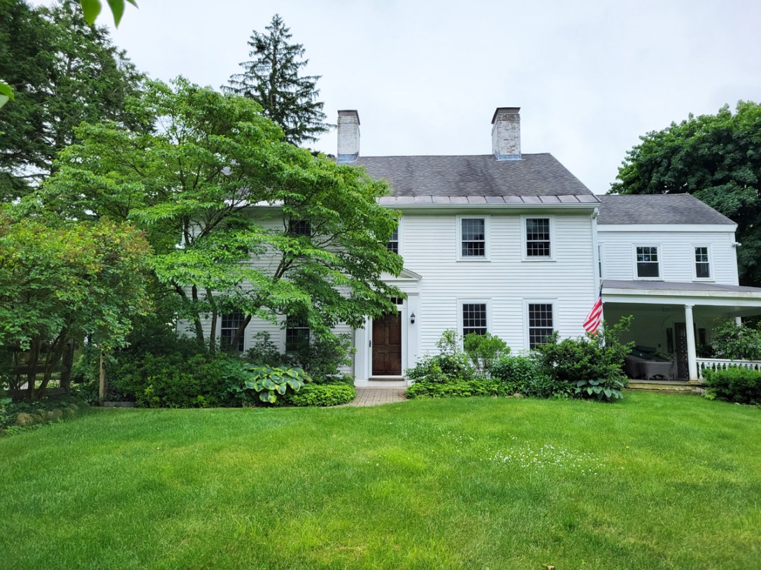 This house has two chimneys, but they are not symmetrically arranged. Paired chimneys became popular in the late 18th Century. The right chimney is supported by a massive brick arch, generally found in the late 18th and early 19th centuries. Rumford fireplaces are found throughout the house, and were common from 1796, when Count Rumford first wrote about them, until about 1850. The upstairs bedroom fireplace surrounds are Federal in appearance; the parlor appears to have been fashioned as a replica of an earlier period, and its fireplace surround is Georgian in character. The room opposite has an ornate Victorian-era fireplace surround.