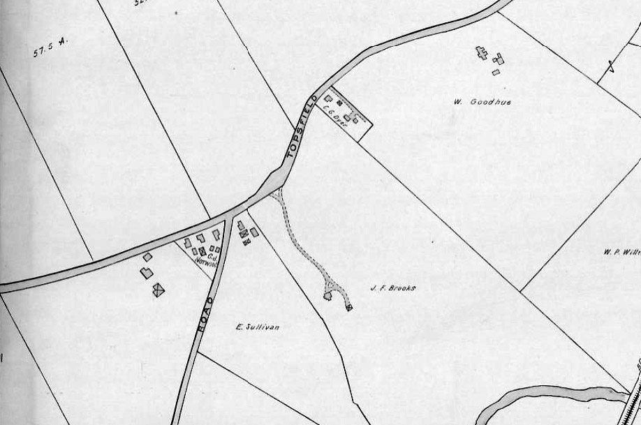 Thomas Franklin Waters wrote that in 1667, Nicholas Waters was among a group of men who proposed to build a dam at the location of the Mill Road bridge. “Sar. Nicholas Wallis,” whose farm is now owned by the Brooks heirs, received permission in March 1686-7 “to improve the water by damming in the river against his own land not exceeding three feet for building a fulling mill or mills, provided he do it within a year and a half.” Sergeant Wallis did not improve his privilege. In March. 1696-7, John Adams, Sen., his son John, Jim, and Michael Farley Jun. petitioned the Town for permission to build a dam, and operate a grist mill and a fulling mill.”