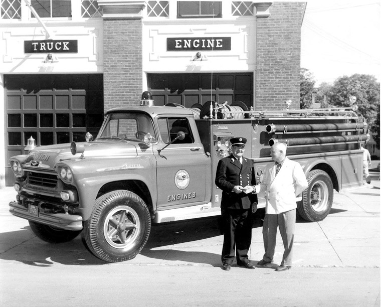Born across the street from the fire station, it must have seemed prophetic when the late chief donned a miniature uniform as fire department mascot in the 1920s to sit in the lead engine in Ipswich parades. In 1956, Frank O’Malley tapped Mr. Scahill on the shoulder and told him he had been unanimously elected fire chief by the board of selectmen.