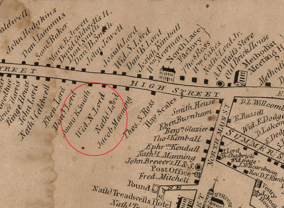 Philip Call House, 26 High St (still standing): “Ammi Smith bought a small piece of the Nathaniel Lord 3rd on the east of his lot, December 9, 1820 (225: 219).”