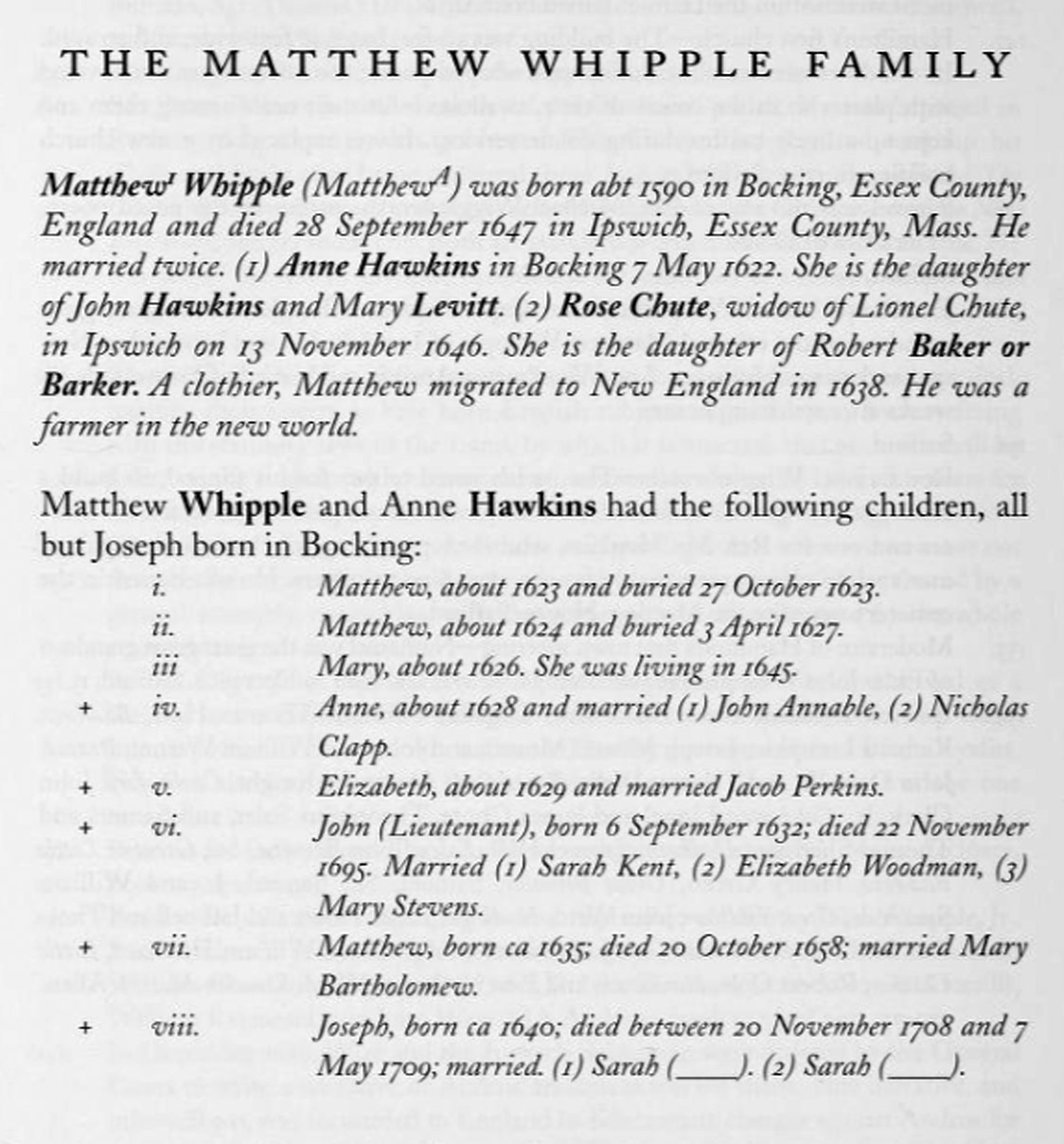 (1) Matthew Whipple, born c.. 1590 in Bocking, Essex, England. Died 28 Sep 1647. Immigrated to Ipswich with his brother John. Married Anne Hawkins (his first wife). Their children: