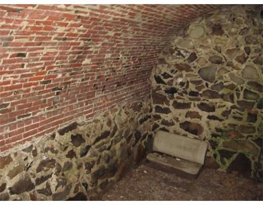 A massive central arched brick chimney foundation in the basement supports five Rumford-style fireplaces, indicating a significant renovation after 1800. The kitchen fireplace features a Federal-era bake oven with its opening in a brick wall. This lot abuts a former Colonial-era brickyard. In the rear yard is a rare mounded stone and brick vault. The present central entrance stairway replaced an earlier configuration when the fireplaces were remodeled.