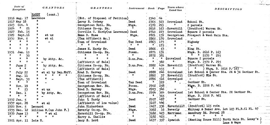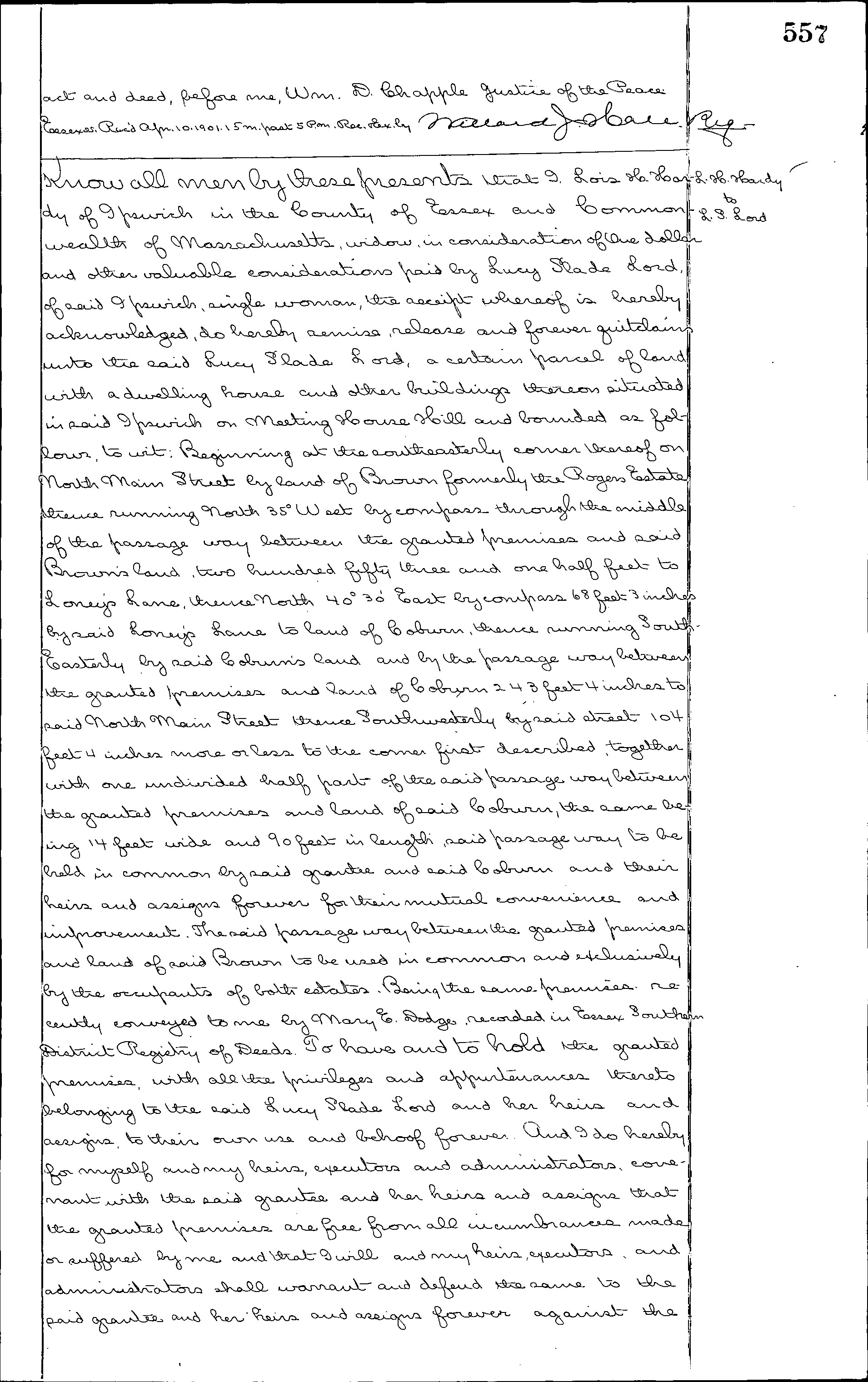 “Jacob Treadwell inherited from his father, Nathaniel, and his administrator sold to Moses Treadwell, the house and land, “being all that said deceased owned in that place, commonly called the old Tavern lot.” The executors of the Moses Treadwell estate sold the house and land to Joseph Baker of Boston. The heirs of Joseph Baker sold to Mrs. Lizzie G. Hayes (1176: 159); Mrs. Hayes to George K Dodge, July 2, 1888 (1227: 508); Dodge to Mrs. Lois Hardy, May 4, 1897 (1514: 11), who transferred to Miss Lucy Slade Lord ( in 1910).”
