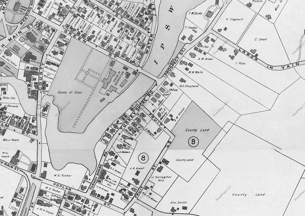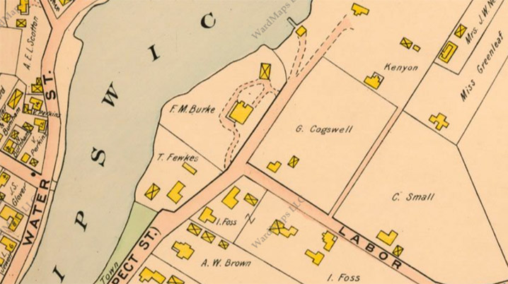 When Roger Preston arrived in Ipswich, he first purchased a lot along the river near what is now the intersection of Turkey Shore and Labor in Vain roads at or near where the Nathaniel Hodgkins house still stands. Thomas Franklin Waters noted that “evidently the neighborhood did not prove popular” and by 1644 every lot had been transferred. The corner of Poplar Street, and the section of Turkey Shore Rd. from Green St. to Labor in Vain have houses dating to the 17th and 18th Centuries. In the early years, the land from Poplar to Green Streets along the hillside was farmland, originally known as “Appleton’s Lot,” although it seemed to change hands frequently. In 1770, John Heard’s rum distillery, which later became a tannery, was constructed near the intersection with Poplar Street. Hunt’s Wharf, later known as Dodge Wharf, was nearby.