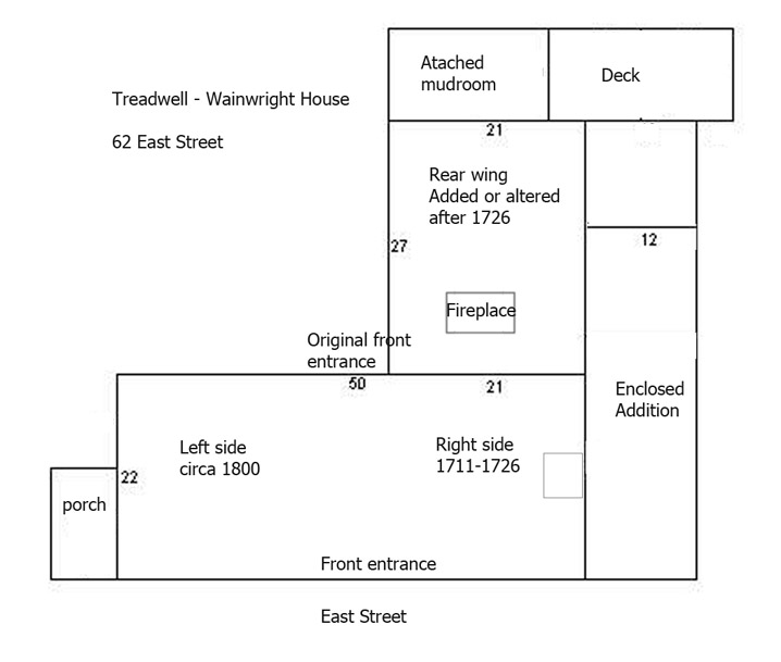 John Leighton sold to Nathaniel Treadwell on April 16, 1691, “parcels of land and the messuages thereon, which were mine. First parcel is the homestead of my house, 3 1/2 acres.” (Salem Deeds Book 9: Page 268). The foundation, fireplace, and chimney in the rear wing of the existing house at 62 East St. may be from the ownership of Nathaniel Treadwell or John Leighton, predating the rest of the house, although the roof framing indicates that the present rear wing was built after the front right section. The front left is of later construction.