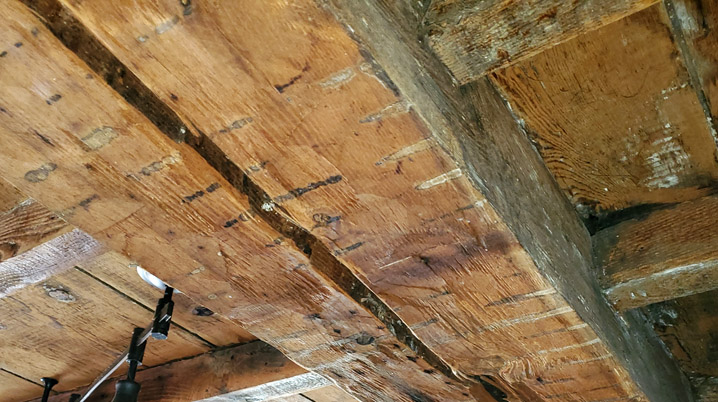 Wilcomb-Pinder Cove Detail. With the existing soffit and fascia peeling away from this First Period house under the relentless weight of the season’s ice, it became time to engage in some overdue carpentry. Between storms, a surgical demolition revealed evidence of a previous coved cornice that we deemed worth recreating. A nearby precedent for a plaster soffit, deemed a sign of personal prosperity in Colonial times, exists a mere 100 yards away in the form of the Stephen Boardman house.